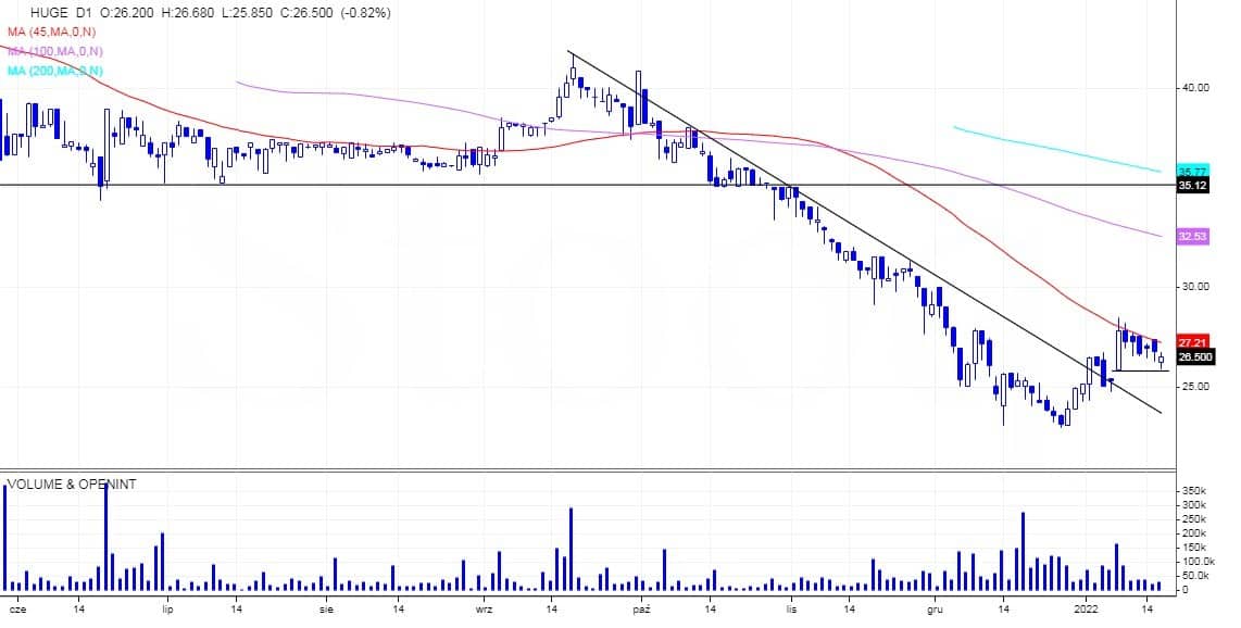 Huuuge do obserwacji szczególnie w obliczu potencjalnego wybicie z marazmu na indeksie WIG.Games (w którym jednak za 50% wagi odpowiada CDR). Słusznie zwrócona została uwaga na blokującą kurs średnią kroczącą.