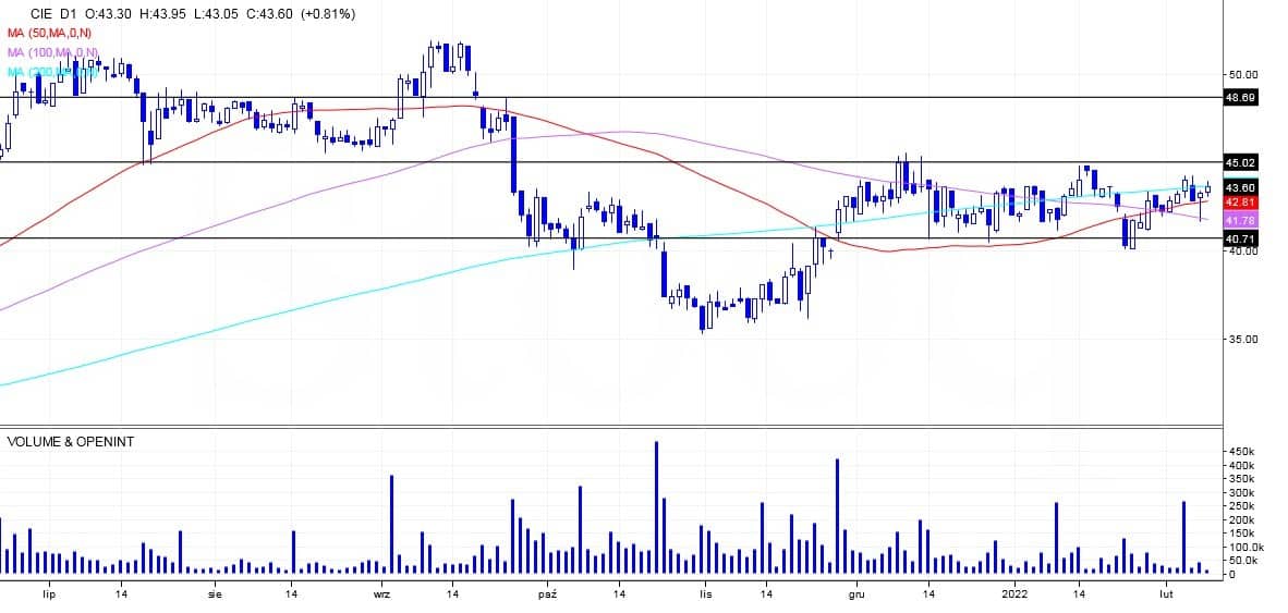 Ciech do szczególnej obserwacji na najbliższych sesjach – właśnie na przebicie oporu 44,00 – 45,00 zł. Tworzy się dalej al’a trójkąt symetryczny.