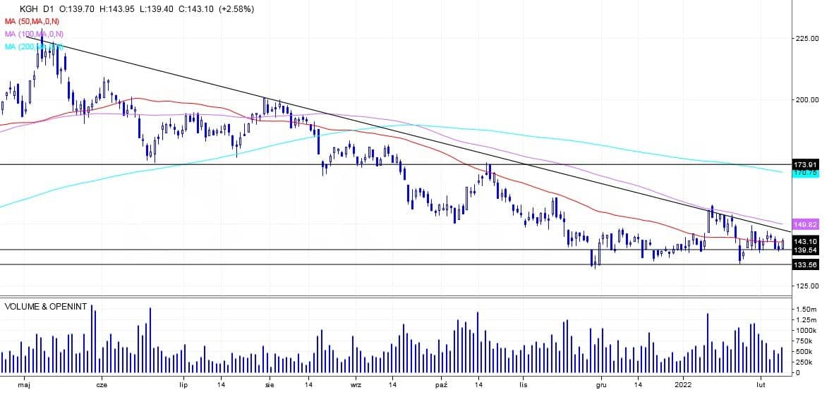Na wczorajszej sesji kurs również pomyślnie wybronił się na luce wzrostowej. Odtąd dopiero wybicie na koniec sesji ~144 zł powinno być oznaką słabości w krótkim terminie. Do obserwacji oczywiście cały czas notowania miedzi, które od maja ub.r. tkwią w trendzie bocznym.