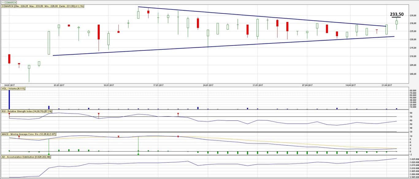Na Comarch natomiat będziemy zagrywać pod potencjalne wybicie górą z al’a trójkąta symetrycznego: pod przebicie 233,50 zł.