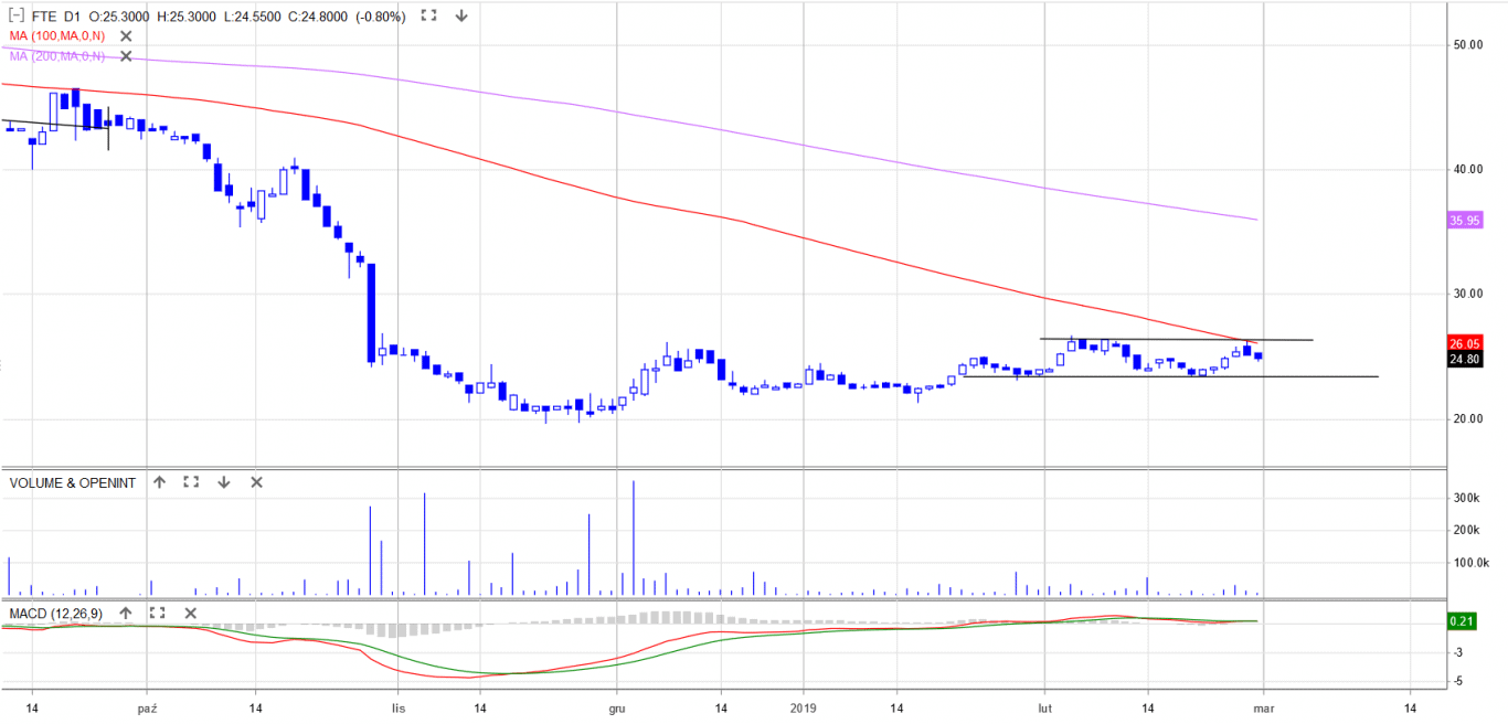 Komentarz: Trend spadkowy w średnim terminie powoli zostaje wyparty przed impuls wzrostowy zainicjowany na początku roku. W tej chwili kurs ponowni znajduje się nad średnimi SMA200 i SMA100 i próbuje wygenerować sygnał kupna tworząc małą konsolidację. Wybicie LimAkt oznaczać powinno kontynuację długoterminowego trendu wzrostowego, a to oznacza, że TP nie jest bliżej określony (110+).
