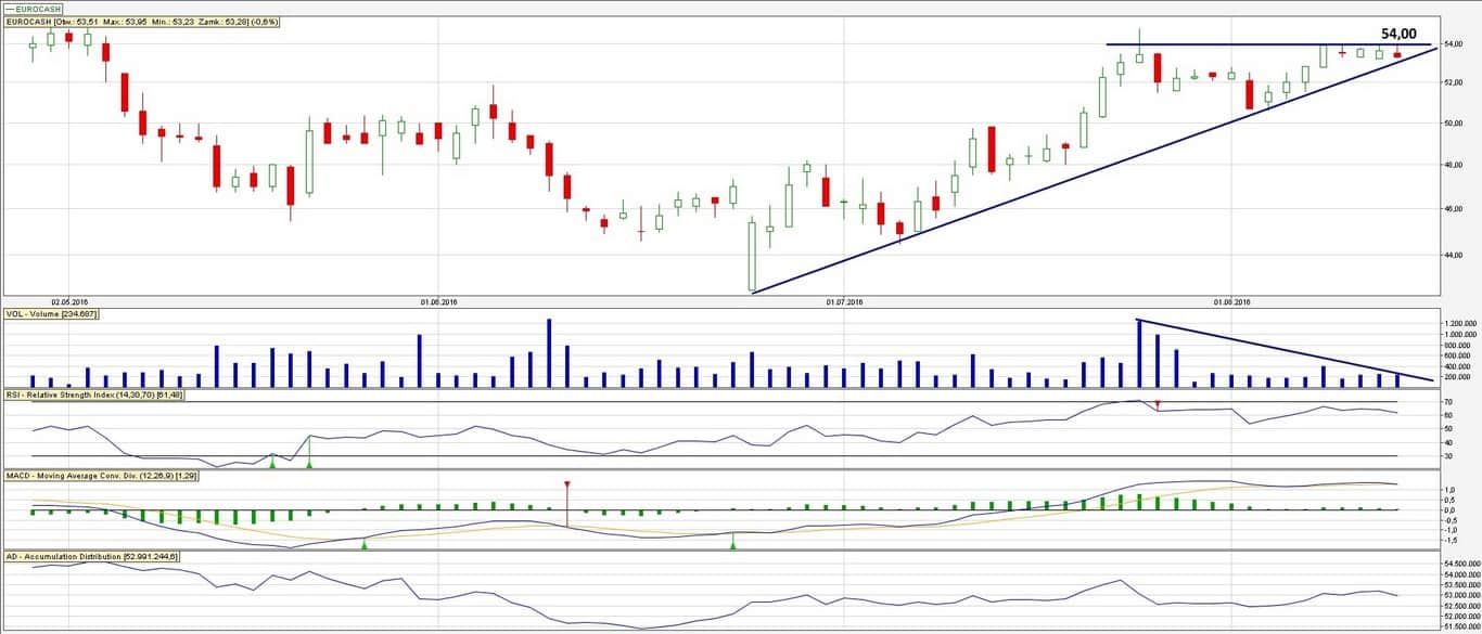 Na Eurocash i na CCC nie pokazuję długoterminowego trendu wzrostowego. Na obu tych spółkach owy trend trwa od początku notowań na giełdzie. Na obu spółkach zagrywamy również typowo pod wybicie z formacji. Na Eurocash będzie to inwestowanie pod przebicie 54,00 zł.