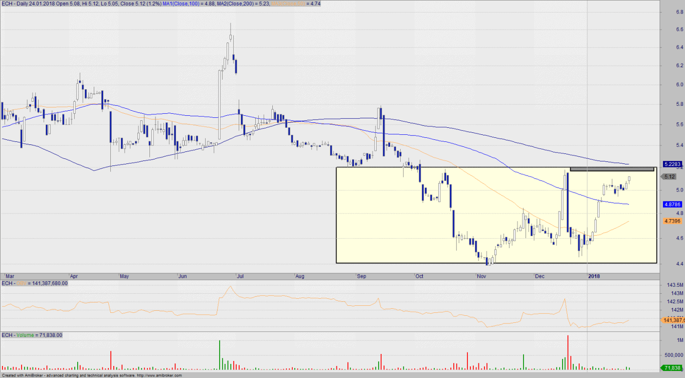 Deweloper Echo charakteryzuje się przede wszystkim tym, że jest lubianą spółką dywidendową. Kurs od miesięcy oscyluje w prostokącie z bardzo widocznymi punktami zaczepnymi. Na tej podstawie możemy ocenić, że wybicie któregoś z ekstremów skutkować będzie silnym sygnałem kupna. My oczywiście obstawiamy wybicie górą.