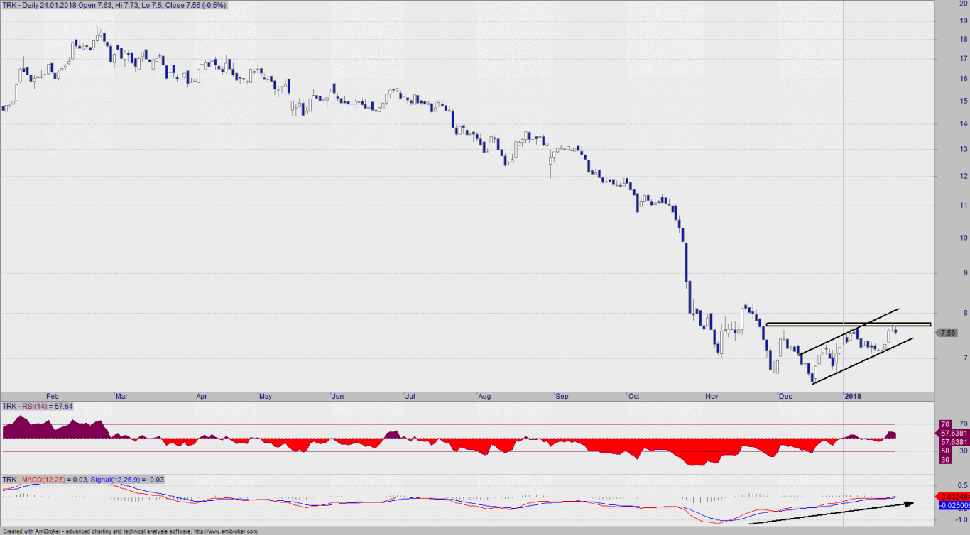 Holendersko-ukraińska spółka odgrywa na ostatnich sesjach bardzo podobny wzorzec sprzed dokładnie roku, kiedy faza konsolidacji na notowaniach oraz rosnącego wskaźnika MACD spowodowało eksplozję kursu. Dodatkowo warto rzucić okiem na większego “kuzyna” Kernela, który wybija z dłuższego marazmu. Nie jest niespodzianką, że spółki ukraińskie za sobą “chodzą”.