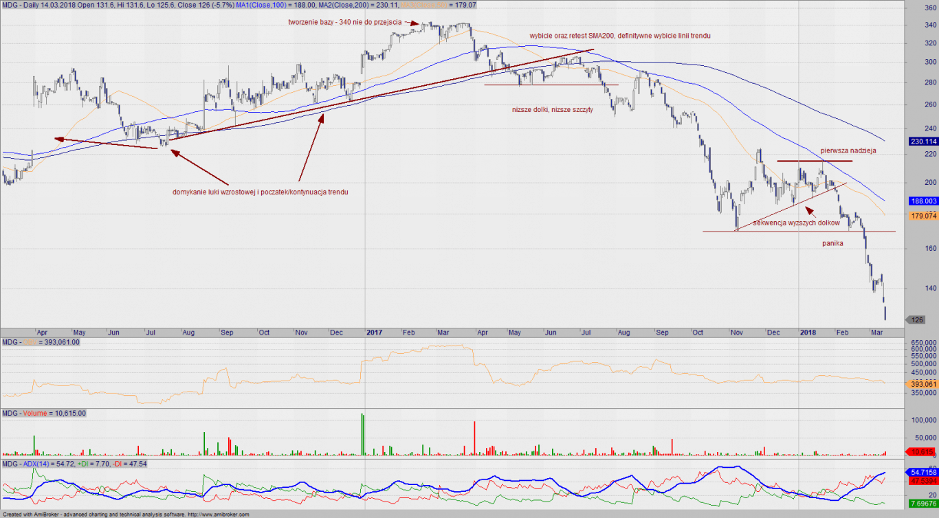 Przykładem jest spółka, która dokładnie rok temu brylowała jako jedna z “najlepszych inwestycji ostatnich miesięcy”. Nie będę wnikał w powód spadków, ale stosując podstawowe zasady analizy technicznej, mogliśmy odpuscić inwestycję w akcje spółki po wybiciu pierwszych wsparć.