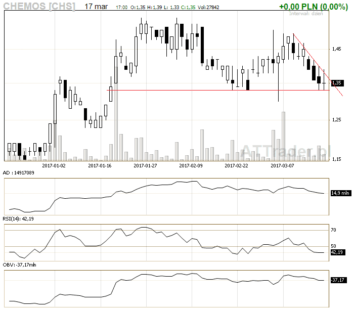 2. Chemos – kurs znajduje się przy wsparciu, zagrywamy na przebicie linii korekty, LimAkt 1,40 zł