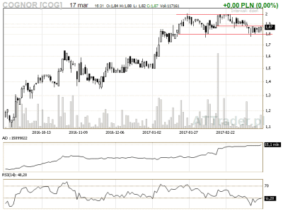 5. Cognor – kurs znajduje się w obszarze konsolidacji, zagrywamy na przebicie obszaru lokalnej konsolidacji LimAkt 1,89 zł (obszar 1,99-2,00 zł stanowi górne ograniczenie kanału właściwego, znajduje się tam istotny opór)