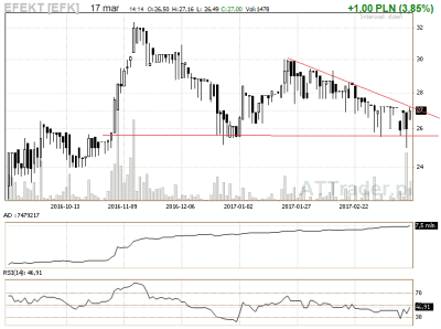 6. Efekt – kurs znajduje się w korekcie, zagrywamy na przebicie linii korekty LimAkt 27,20 zł