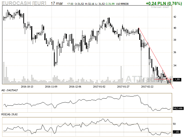 7. Eurocash – kurs przebił linię korekty i aktualnie zmaga się z przebiciem poziomu 32 zł, zagrywamy na przebicie tego oporu LimAkt 32,02 zł