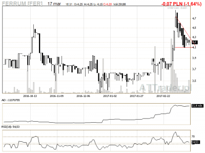 8. Ferrum – na wykresie widoczna dość spora korekta na mniejszych obrotach, zagrywamy na przebicie linii korekty LimAkt 4,30 zł