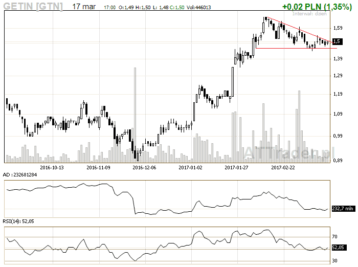 9. Getin – na wykresie znajduje się trójkąt i będziemy zagrywać na wybicie z trójkąta, LimAkt 1,53 zł