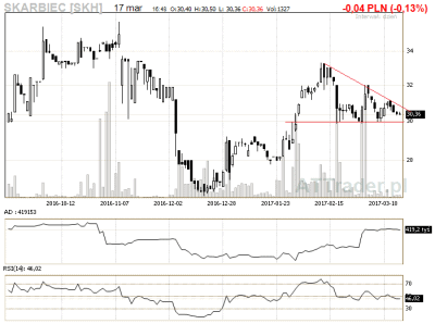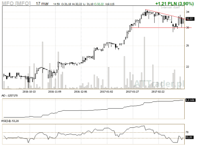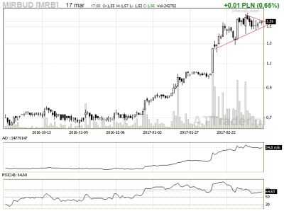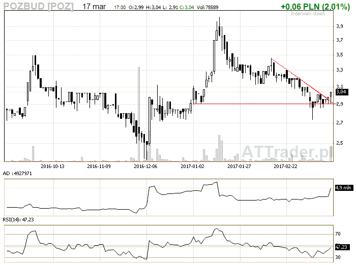 4. Pozbud – mój faworyt z tego zestawienia, przebicie górnego ograniczenia trójkjąta na sporym wolumenie może zwiastować wzrosty na kolejnej sesji