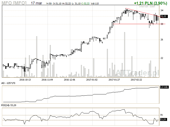 11. Mfo – spółka znajduje się w korekcie i zagrywamy na przebicie linii korekty, LimAkt po przebiciu 32,49 zł (następne zlecenie w arkuszu jest za 32,99 zł)