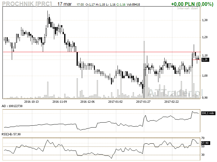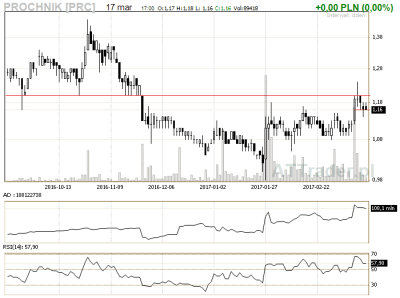 15. Próchnik – zagrywamy na przebicie linii oporu znajdującą się na 1,20 zł, LimAkt 1,21 zł (lokalne wsparcie znajduje się na 1,16 zł w połowie świecy wzrostowej)