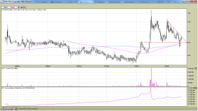 2. Atlantis – spółka bardzo spekulacyjna ze stajni Patrowicza, ale na wykresie widać formację trójkąta zniżkującego, gdzie kurs doszedł do górnego ramienia tej formacji. Zagrywamy na wybicie z tej formacji z przykładowym LimAkt 0,76 zł.