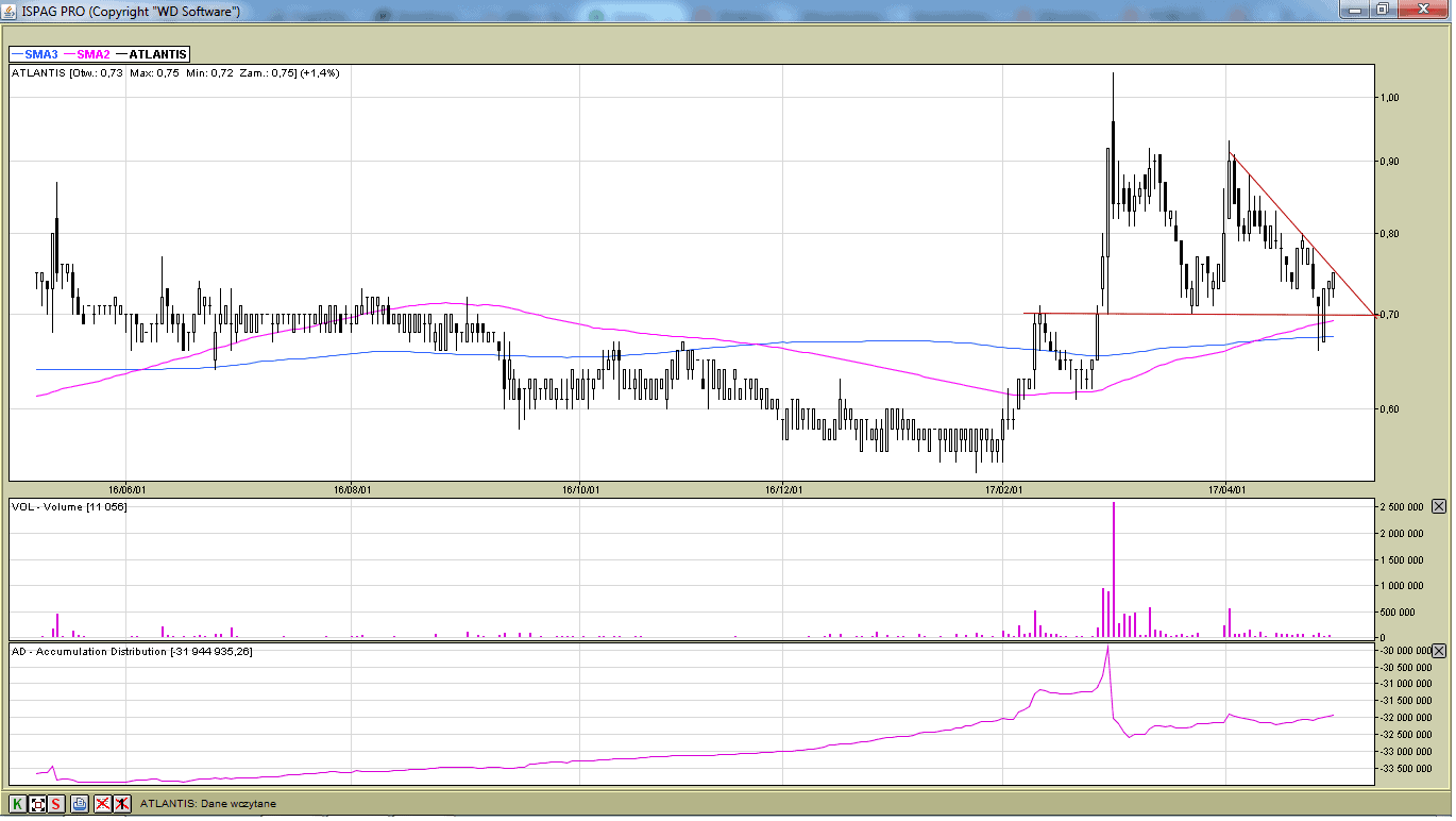 2. Atlantis – kurs wczoraj odbił się od wsparcia na poziomie 0,70 zł, czekamy na wybicie z formacji.