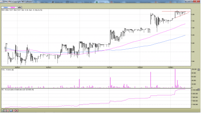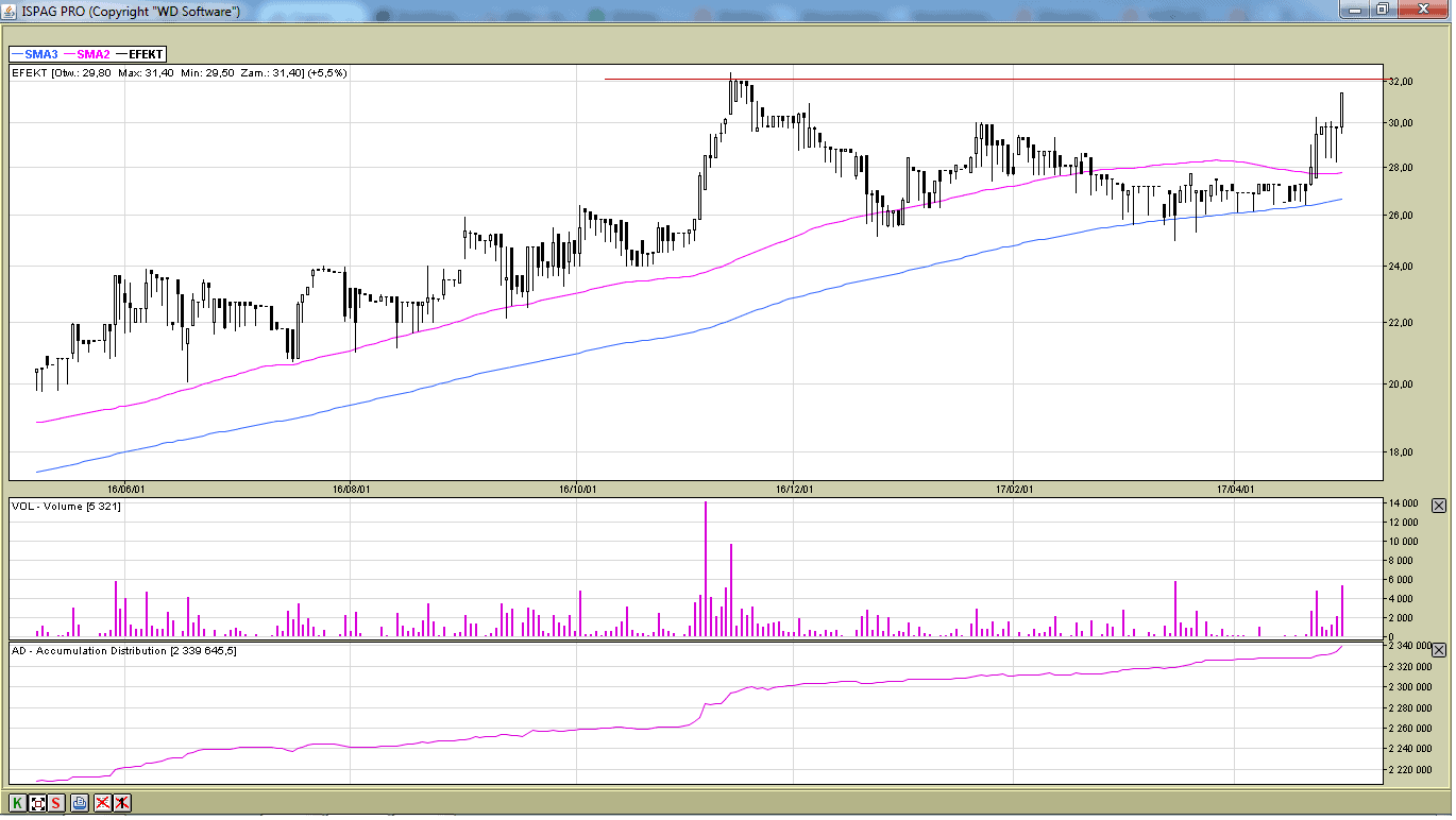 4. Efekt – kurs zbliża się do historycznego oporu na poziomie 32 zł. W ostatnim czasie na wykresie widać wzmożone obroty jak na tą spółkę podczas wzrostów i zwiększoną akumulację akcji. Zagrywamy na przebicie oporu na 32 zł z przykładowym LimAkt 32,01 zł.