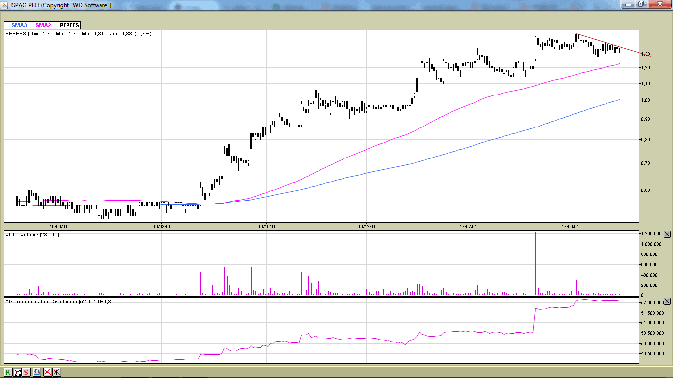5. Pepees – na wykresie spółki można wyrysować formację a’la trójkąta zniżkującego. Zagrywamy na wybicie z tej formacji oraz przebicie oporu na poziomie 1,39 zł (aktualnie znajduje się około 100 000 akcji na S) z przykładowym LimAkt 1,40 zł.