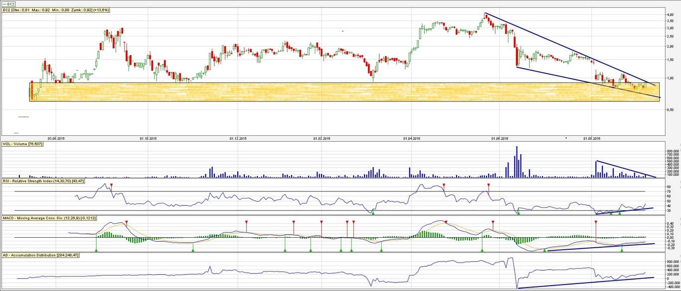 Teoretycznie – z czysto technicznej strony – jesteśmy przy wsparciu oraz w okolicy przebicia linii trendu spadkowego i wyjścia z tego al’a klina zniżkującego. Biorąc pod uwagę, że w spółce aktualnie Free Float wynosi 100%, to spekulanci mogą swoje zrobić. Wzrosty spekulanckie są możliwe – patrząc, że powoli znowu jest głośno o spółce. Obrót dzienny na spółce wynosi jedynie 50 tyś zł, co bardziej przyczynia się do spekulanckich zagrań na tej spółce.