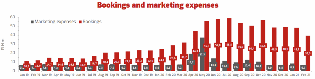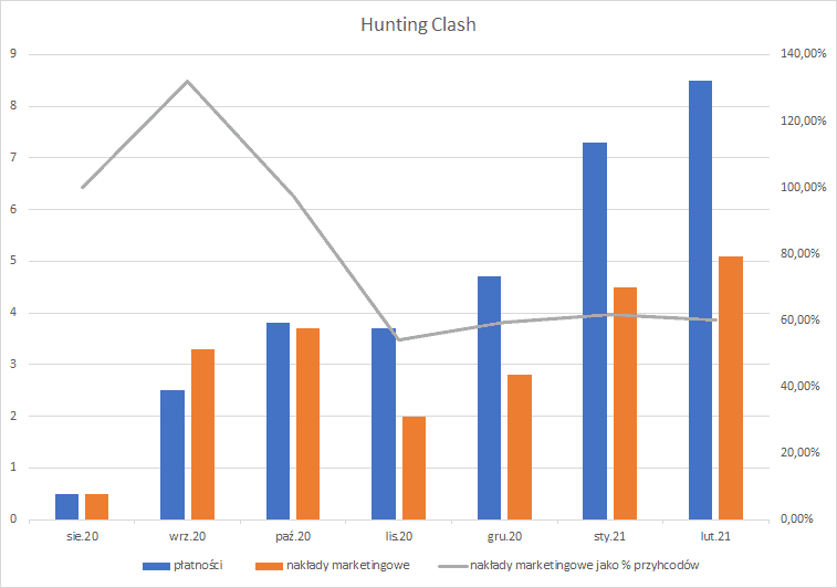 Zwróćmy uwagę, że od samego początku przychody uzyskiwane z Fishing Clash przewyższały wydatki marketingowe. Przychody bardzo dynamicznie skoczyły podczas lockdownu i po tym okresie delikatnie spadły co budziło wśród inwestorów niepokój, ostatnie dane to luty mający 28 dni co też delikatnie zaburza obraz całej sytuacji. Pojawienie się w sierpniu Hunting Clash i pierwsze trzy miesiące raportowania sprzedaży oraz wydatków na grę nie zwiastowały nic dobrego – wydatki równały się lub przewyższały uzyskane płatności. Na szczęście obraz uległ znacznej poprawie od listopada 2020 i do lutego 2021 tendencja ta jest podtrzymana: