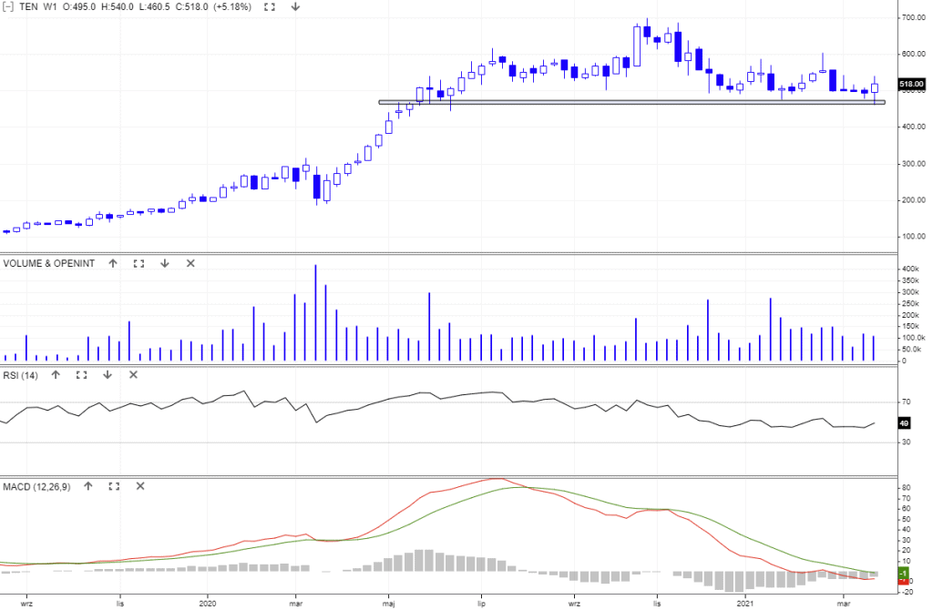 Kurs TEN znajduje się w długoterminowym trendzie wzrostowym, na interwale tygodniowym wsparciem dla kursu jest poziom ~470 zł, na który podczas ostatnich sesji bardzo ładnie zareagował. Oscylator MACD również jest bardzo nisko: