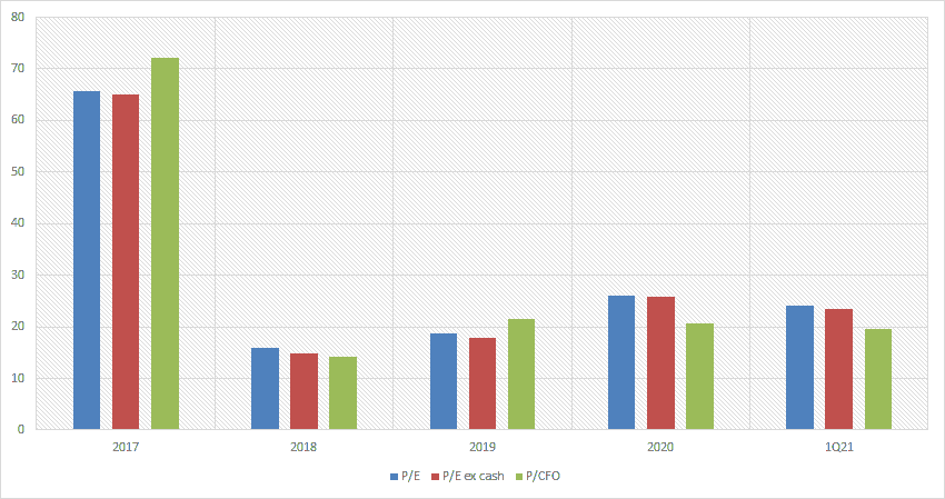 Poniżej przedstawiam wycenę spółki w ujęciu standardowego wskaźnika P/E oraz P/E ex. cash i P/CFO: