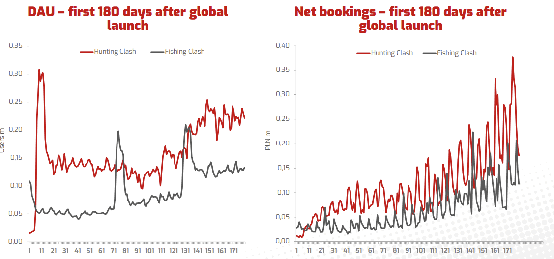 W prezentacji spółka przedstawiła bardzo ciekawy wykres pokazujący, że po 180 dniach od global launch Hunting Clash ma lepsze statystyki od Fishing Clash: