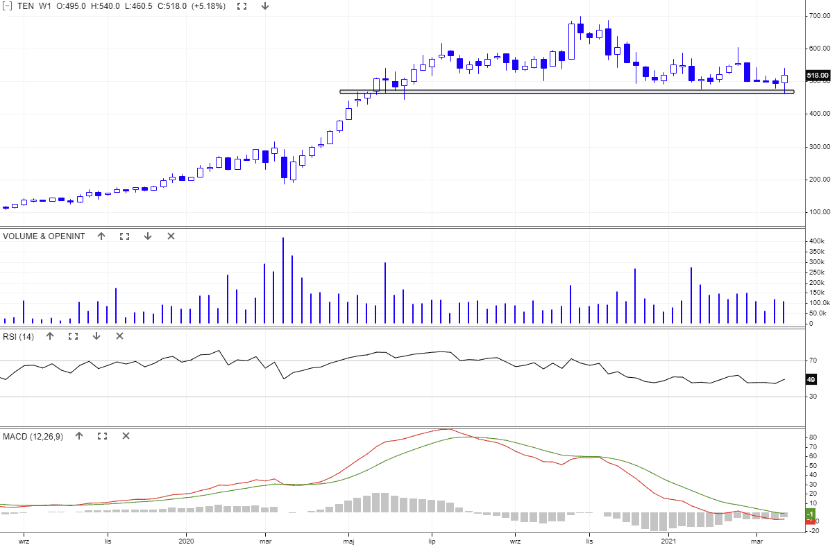Kurs TEN znajduje się w długoterminowym trendzie wzrostowym, na interwale tygodniowym wsparciem dla kursu jest poziom ~470 zł, na który podczas ostatnich sesji bardzo ładnie zareagował. Oscylator MACD również jest bardzo nisko: