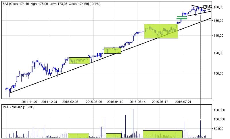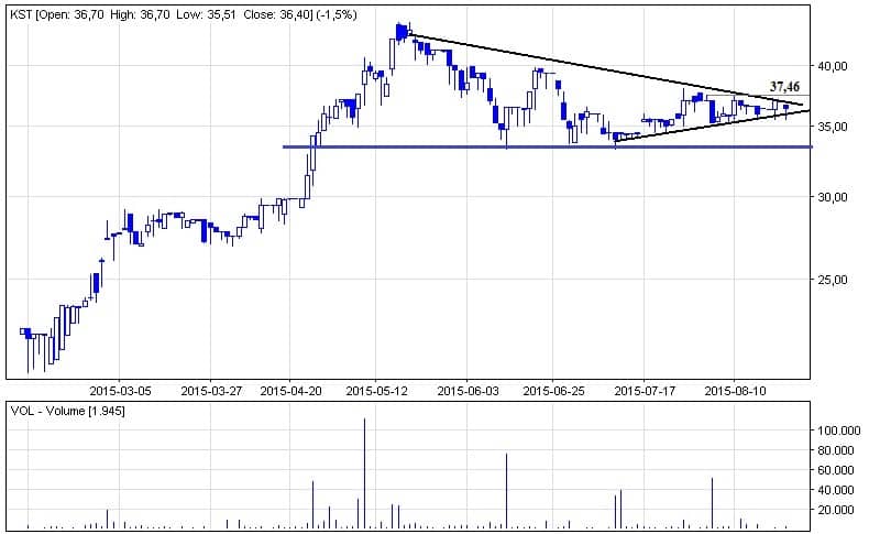 Komentarz: aktualnie tworzy nam się poadana wyżej formacja techniczna. Krótkoterminowo sprawa wygląda tak, że ruch podąży zgodnie z kierunkiem wybicia. Większe prawdopodobieńśtwo jest jednak, że kurs z formacji wyjdzie zgodnie z kierunkiem trendu. Jaki trend panuje aktualnie mamy napisane wyżej (trend wzrostowy). Amrest należy do tak zwanych mocnych spółek technicznych – z coraz wyższymi swingami niemal od początku notowań. Aby jednak sprawdzić, czy w szerszej perspektywie trend czasem nie zatraca na sile, wystarczy przeanalizować tradycyjnie układ wolumenu. Jedną z możliwości jest właśnie patrzenie na występujące korekty i wolumen w tym czasie (zaznaczyłem na wykresie). Aby prawdopodobieńśtwo przenieść na naszą stronę/sprawdzić, czy jest po naszej stronie, możemy się również posilić analizą wolumenu wewnątrz formacji. Wolumen powinien być z reguły spadający/powinien się zmniejszać w środku formacji. Jednak jak sytuacja odbiegnie od tej reguły, to należy oczywiście z tego skorzystać. Mieliśmy jedną sesję wewnątrz formacji z ogromnym wolumenem. Podczas tej sesji ukształtowała się pozytywna świeca. Należy również i z takich informacji korzystać.