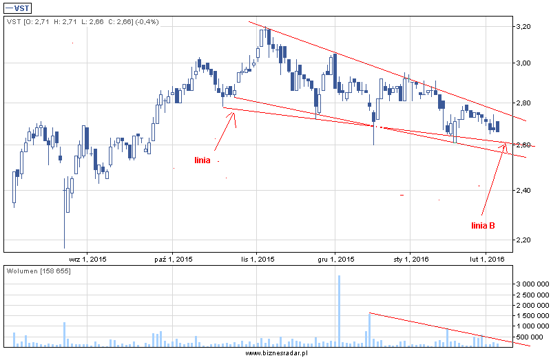 Analizując kurs spółek z branży odzieżowo-obuwniczej można odnieść wrażenie, że zarówno Bytom, Gino Rossi czy Vistula poruszają się w klinie zniżkującym. Powyższy wniosek jest słuszny, Vistula tak jak Bytom i Gino Rossi porusza się w klinie zniżkującym, z tą różnicą, że zarówno Gino Rossi jak i Bytom już wybiły a Vistula jeszcze nie. Jakiś czas temu analizowałem w ramach STS-ów Vistulę, która niestety wybiła dołem z trójkąta. Kurs od 4 listopada 2015 r. porusza się więc w średnioterminowym trendzie spadkowym z coraz niższymi dołkami i szczytami. O zbliżającym się wybiciu świadczą zanikające obroty. W trendzie spadkowym jest to o tyle istotne, że pokazuje rychłe jego odwrócenie.