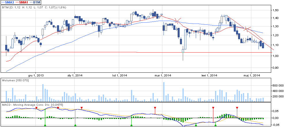 Co bym zrobił? Posiadając tę spółkę, ustawiłbym sl na 1,03 pamiętając równocześnie, że może dojść do czyszczenia stopów. Gdybym miał wolną gotówkę, czekałbym na lepszy moment do wejścia. Ewentualnie zastanawiałbym się nad wejściem przy 1,13, poziom, który lekko naruszyłby linię trendu spadkowego i który się znajduje nad lokalnym oporem.