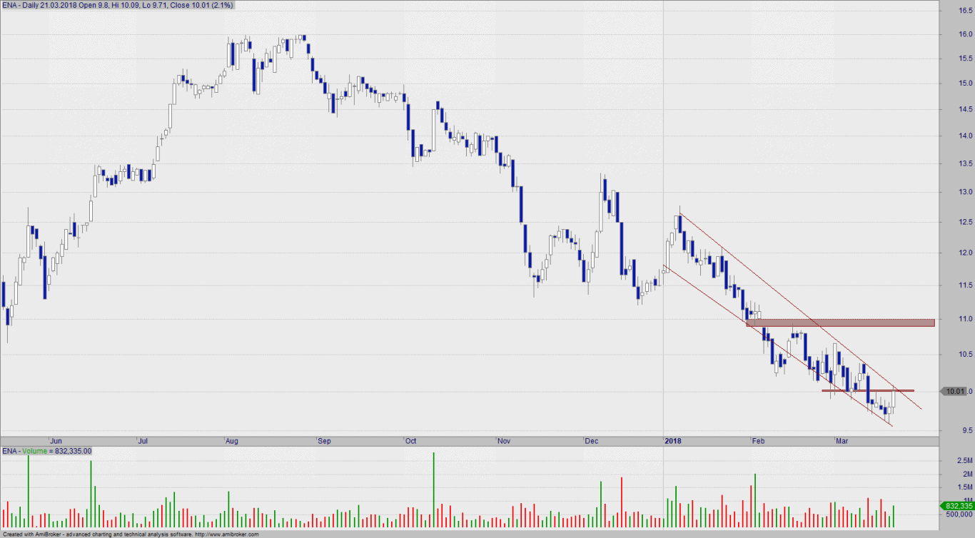 Wzrosty na Enei zatrzymały się idealnie na wybitym niedawno wsparciu, który teraz stanowi silny opór. Kurs znajduje się ponadto w silnym kanale spadkowym, jednak którego wybicie skutkować powinno wzrostem do luki spadkowej z początku lutego. Przyznaję, że taki scenariusz jest bardzo prowzrostowy, co w obecnym trendzie jest niemalże nie do pomyślenia.