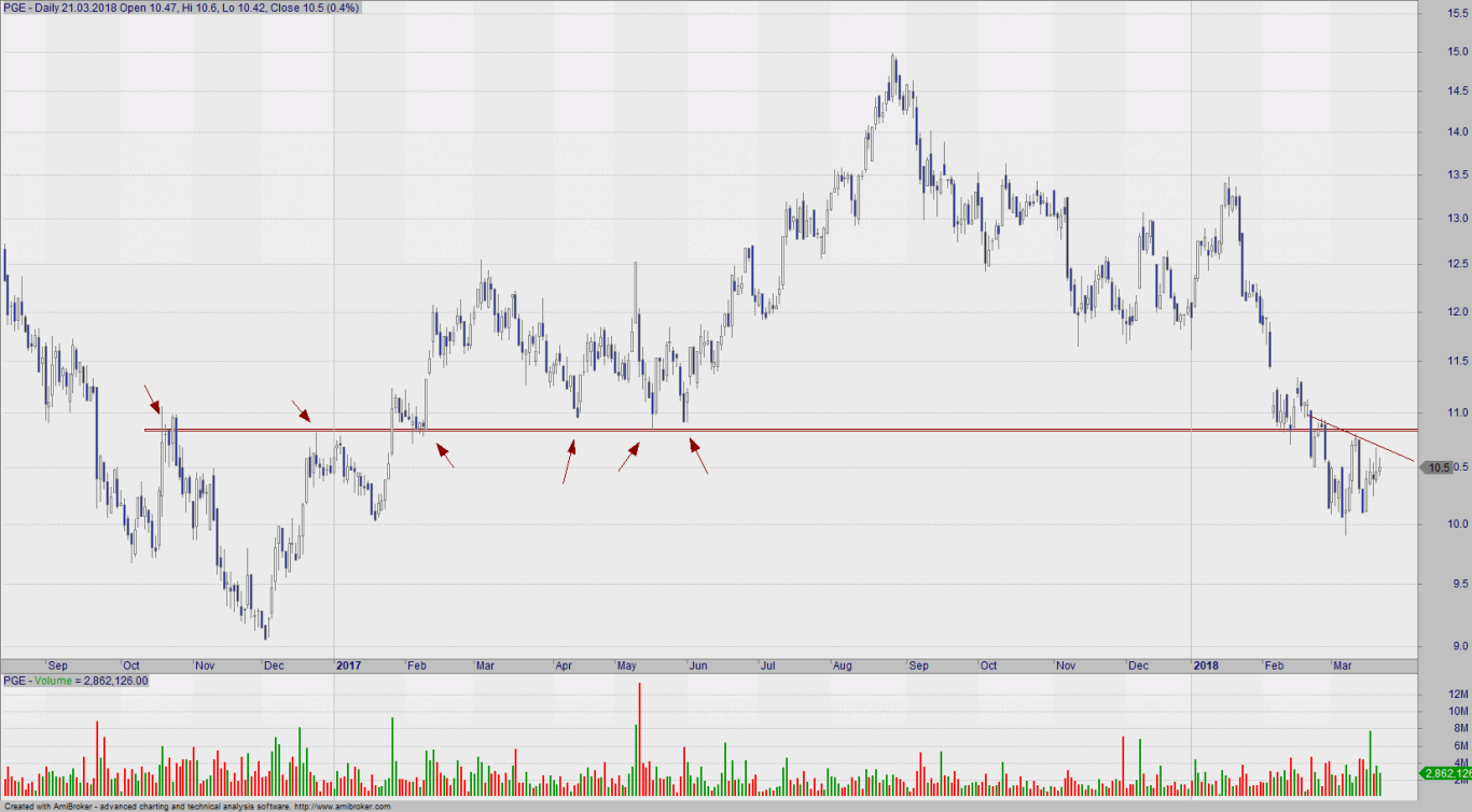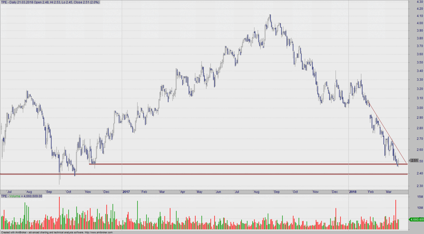 Powyższy wykres w imponujący sposób pokazuje, co może wyczynić się na giełdzie papierów wartościowych przez okrągły rok. Akcjonariusze spółek energetycznych przeżyli w 2017 roku niemały rajd w górę, aby chwilę później być świadkami końca dobrej passy niedawno tak chwalonych spółek. W ostatnich paru tygodniach kurs zbliżył się znacząco do kolejnego istotnego wsparcia. W tym miejscu dochodzi do utworzenia formacji diamentu, która charakteryzuje się odwróceniem trendu. Jak jednak zauważymy, na dzisiejszej sesji pomimo świetnych nastrojów, nie udało się wybić z formacji górą. Dopiero wybicie górą z formacji, tzn. nad 2610, pozwoli stronie popytowej na silniejsze zakupy. Do tego czasu musimy mieć przed oczami główny, spadkowy trend.