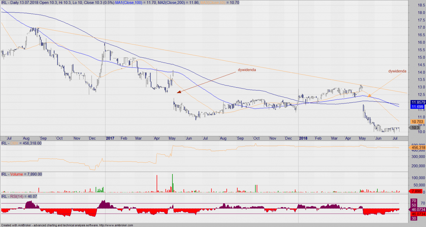 Trójkąt zniżkujący i sytuacja analogiczna do pozostałych wykresów. Jest to najbardziej przeceniony walor, ale nie oznacza to, że wzrosty będą tu najsilniejsze. Czekamy na wybicie się nad SMA100, ew. nad zieloną strefę.