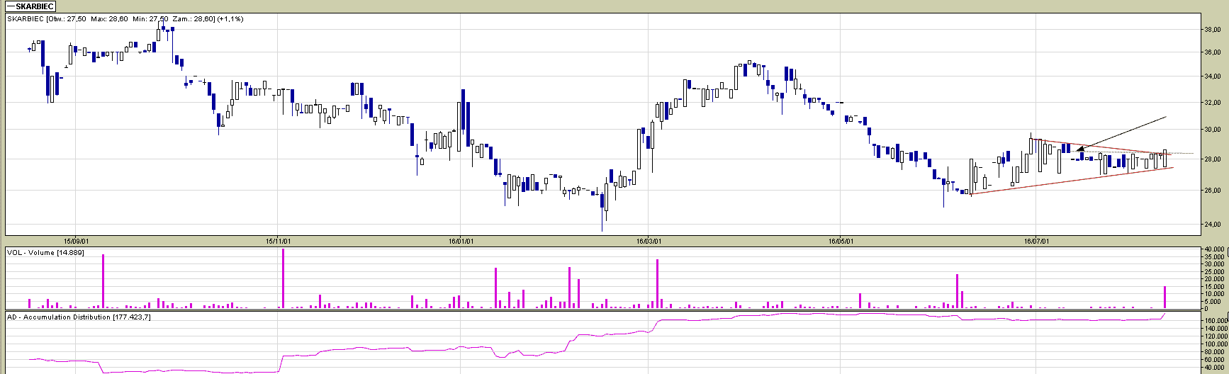 Spółka Skarbiec wybiła na środowej sesji z małego symetrycznego trójkąta, który tworzył się od conajmniej końca czerwca. Wybiciu towarzyszył podwyższony obrót, a marubozu (duża biała świeca) zdołała domknąć spadkową lukę z połowy lipca – jest to prowzrostowy znak. Oczekiwać należy kontynuacji wzrostów wstępnie do ostatniego szczytu, który zatrzymany został na wcześniejszej luce bessy.