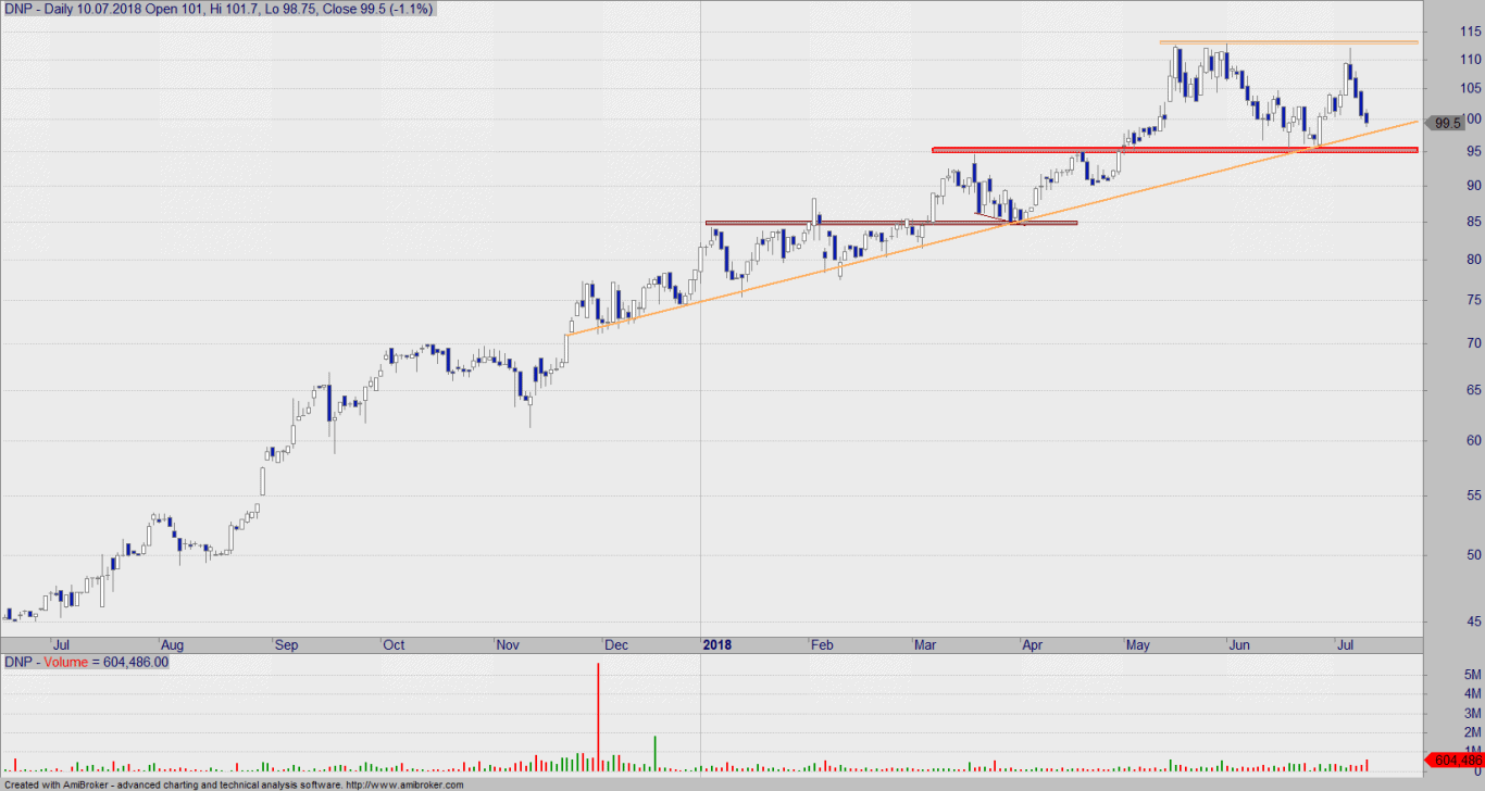 Wykres o zupełnie innym charakterze. W przypadku DNP zagrywać może pod utrzymanie długoterminowego trendu wzrostowego. Powoli kurs dochodzi do istotnego wsparcia i zarazem linii trendu wzrostowego – przypominam, że siła popytu panuje tutaj od debiutu Emitenta. Powoli wypełniać powinna się także formacja trójkąta zwyżkującego.