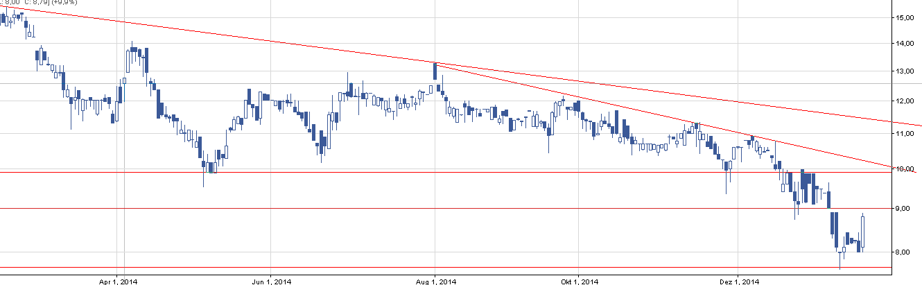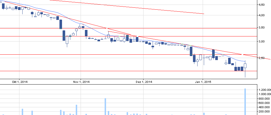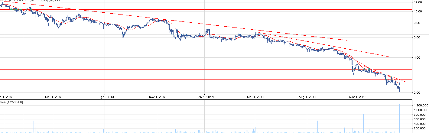 Nie od dziś wiecie, że na wykresach szukam perełek, które zaczynają nowy akapit w swoim życiu pod tytułem “trend wzrostowy”. RNK to spółka w trendzie spadkowym od marca 2012. Jest to bardziej ryzykowne zagranie aniżeli inwestycja w trendzie czysto wzrostowym/ w korekcie. Taką spółką powinny się zainteresować głównie ci, którzy szukają spekulacyjnch zagrań opartych na analizie technicznej. Moją uwagę zwrócił drugi w historii spółki tak silny obrót. Średni obrót na spółce wynosi mniej niż 50.000 zł, a tymczasem w piątek wyniósł on 2,6 mln zł. Istnieją różne szkoły, które głównie na podstawie wolumenu będą chciały ustalić co się dzieje na walorze. Ja w takim przypadku wolę dorysować jeszcze parę pomocnych kresek. Podsumujmy: Na RSI sygnał kupna, dotknięte SMA15 (w bliskiej przeszłości niejednokrotnie się to zdarzało, ale kurs szybko negował przebicie), historyczny wolumen, wsparcie poniżej trzech spadkowych świec. Obecnie widzę podwójny opór na poziomie 2,6 zł wynikający z a) jednego z trendów spadkowych i b) lokalnego oporu. Dla wchodzących w walor spekulantów ustawiłbym SL w okolicy 2,15.