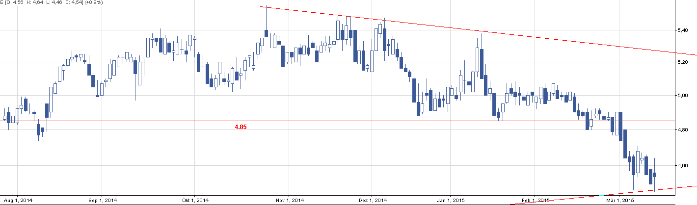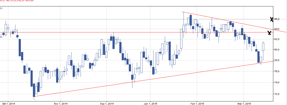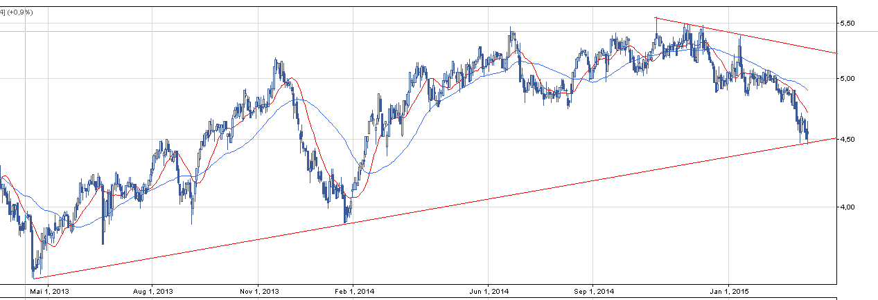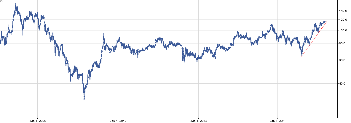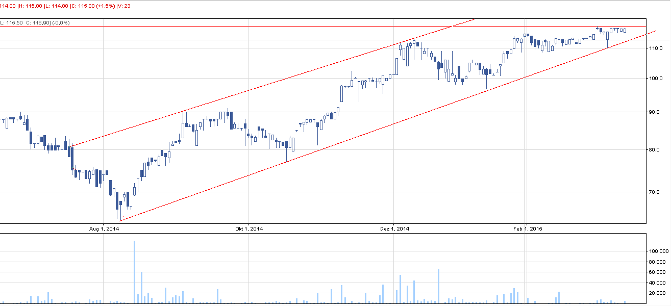 Kurs nie bez powodu znajduje się przy 117 zł. W tym miejscu bowiem utworzona została prawie 7 lat temu luka spadkowa, która zapoczątkowała bessę ze swoim mocnym trendem spadkowym. Od punktu kulminacyjnego, w marcu 2009 roku, kurs spółki się ożywił, ale niejednokrotnie testował swój wzrostowy trend. Ostatnia korekta miała miejsce w sierpniu 2014, a niedługo później kurs ruszył w górę osiągając niedawno swój lokalny szczyt.