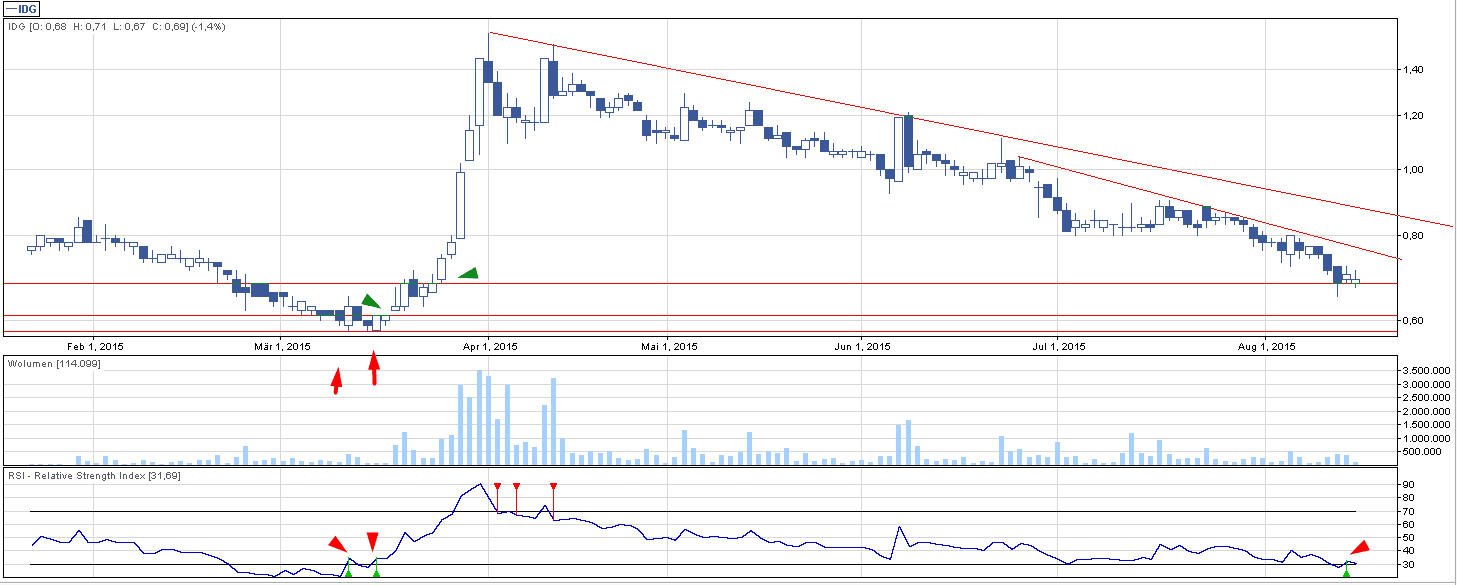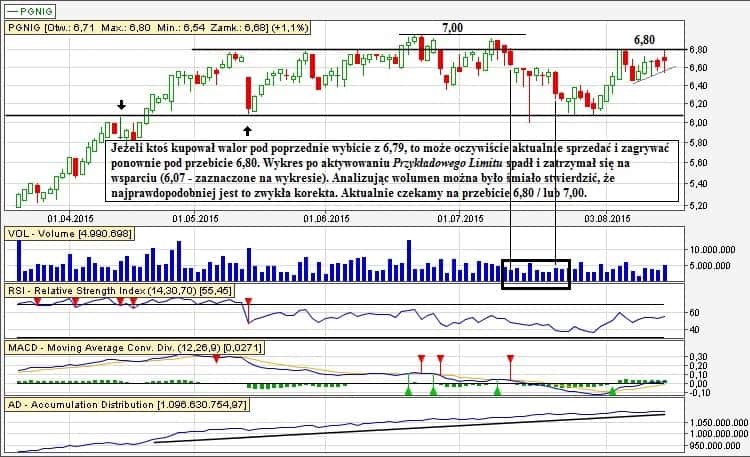 Potężne wybicie z kwietnia zostało tylko wspomnieniem, ale co ciekawe, znajdujemy się właśnie w rejonach przed tym wybiciem. Korelacja wskaźnika RSI z wykresem wygląda obiecująco, bowiem rzadko dochodzi tam do utworzenia sygnału kupna, a ostatni sygnał kupna pozwolił właśnie na ten niezły rajd w górę. Jeżeli ma dojść do wybicia, to powinno ono nastąpić w okolicach 75 gr – przebita zostanie wtedy zniżkująca linia.