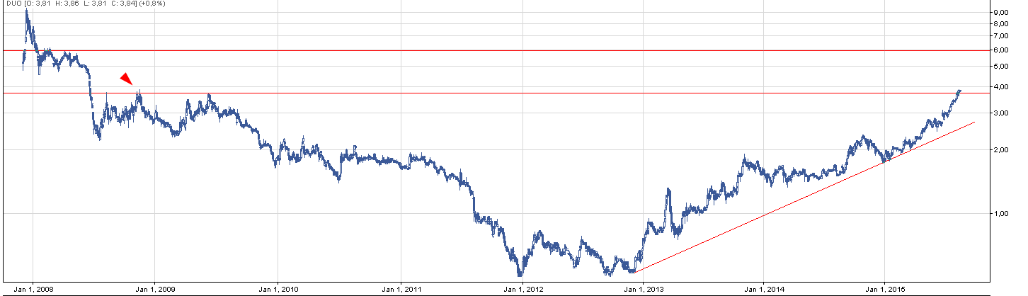 Od początku roku spółka wzrosła o prawie 100 % i zmierzać się będzie z kolejnym psychologicznym oporem na poziomie 4 zł. Ostatnie wzrosty na spółce były na tyle dynamiczne, że pierwsze wsparcia mierzyłbym bardziej na wykresie historycznym aniżeli na lokalnym i są to 3,72 oraz 3,5 zł. Szacuję, że przebicie 4 zł powinno dać paliwo do wzrostów do nawet 6 zł. Ostatnio DM PKO BP rekomendowało DUON