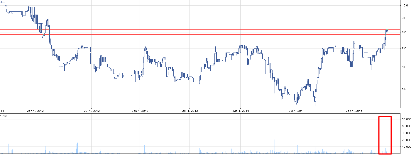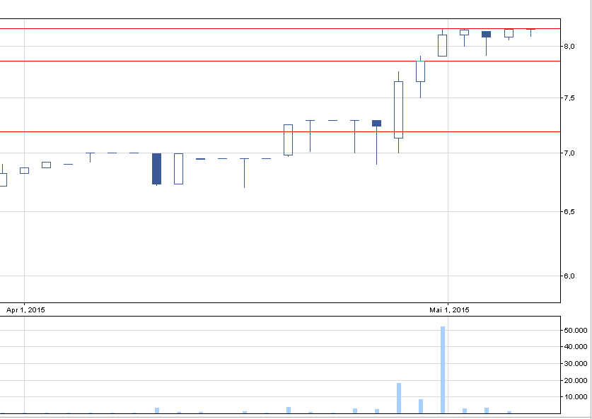 Niedawno kurs przebił się przez opór, a w zeszły czwartek doszło do historycznego obrotu – 416 tys. zł. Poza tym kurs konsoliduje się przy nowym oporze na 8,17 zł i widoczne jest blokowanie dalszych wzrostów. Z reguły dalsze wzrosty powinny przyjść niedługo patrząc na prowzrostowe świeczki oraz utrzymanie jednego poziomu, ale nie oznacza to, aby wchodzić w spółkę przed wybiciem, które wyznaczam z LimAkt na 8,18 zł. Obrót na ostatniej sesji wyniósł niecałe 1500 zł, co trochę psuje ochotę na inwestycje, ale większy popyt pojawić się powinien po przebiciu.
