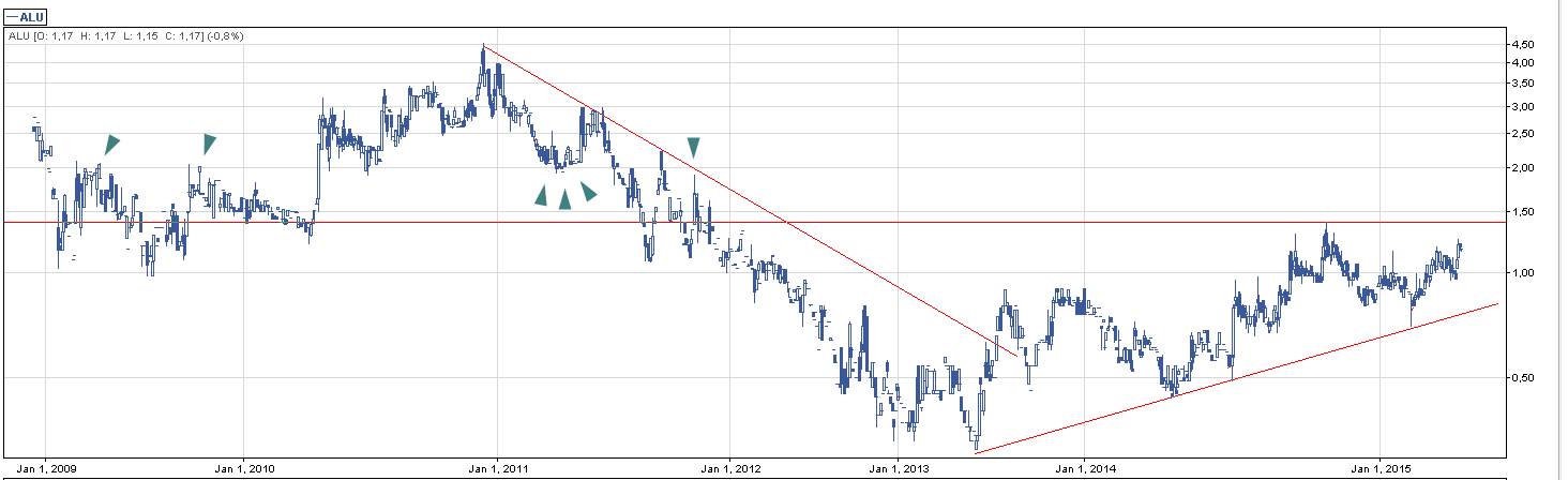 Na pierwszy ogień idzie NewConnectowy Alumast, który zwrócił swoją uwagę przez mocniejszy wolumen na wzrostowej świeczce z 31.03. Ponadto wygenerował się sygnał kupna na parze MACD + STS, ale całość psuje słaby obrót, który wyniósł na ostatniej sesji 7 tys. zł. Spółka jednak znajduje się od ok. 9 miesięcy w trendzie wzrostowym, ale faktycznym momentem do zaangażowania się w akcje Alu będzie przebicie ostatniego szczytu na poziomie 1,4 zł, tzn, przykładowy LimAkt na 1,41. Przebicie tego poziomu pozwoliłoby dojść kursowi do okolic 2 zł, gdzie widoczny jest kolejny znaczący opór wynikający m.in. z dwumiesięcznej konsolidacji kursu w pierwszej połowie 2011 roku oraz conajmniej trzech prób przebicia się.