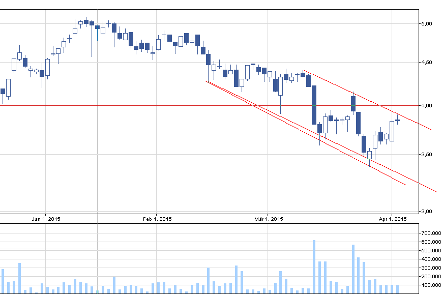 Arctic zasługuję na uwagę z okazji ew. tworzenia się kanału spadkowego, ale niestety zniżkującego. Jestem bardzo ciekaw, czy kanał się utrzyma czy też dojdzie do pewnego wybicia się z niego. Za spadkową rolą Act przemawia głównie tworzący się, spory wolumen na spadkowych świecach. Jeżeli kanał znajdzie potwierdzenie na nastepnej sesji, to będzie można zastanowić się nad zagraniem w kanale – tzn. zakup akcji w okolicach dolnego ograniczenia oraz spieniężenie ich wyżej. Dodać muszę, że gra w kanałach bywa dobrym zarobkiem, ale tyczy się to głównie kanałów wzrostowych oraz bocznych. Gra w kanale zniżkującym zaliczana jest do spekulacyjnej z uwagi na podwyższone ryzyko potencjalnej straty. Czy Arctic przebije w najbliższym czasie 4 zł? Czwartkowa świeczka niezdecydowana jest, a w takiej konstelacji świec jaką mamy teraz spodziewam się kontynuacji w dół.