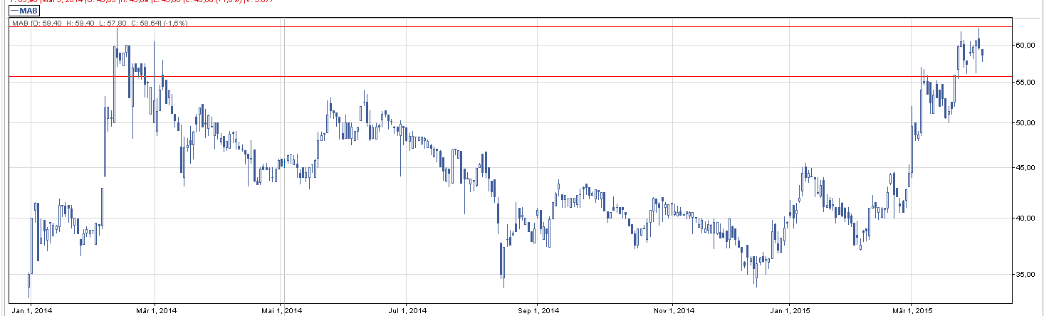 Mabion to przykład spółki, która lubi gdy się na nią poczeka. W miarę długo oscylowała przy 40 zł, a nawet raz przebiła na krótki okres ten poziom, aby wkrótce potem znaleźć się ponownie pod nim. Obecnie kurs dobija z chęcia do poziomu 60 zł, ale ma problem ze zdecydowanym przebiciem. Powodem jest ostatni opór w okolicy 62,7, który tworzy zarazem najwyższy szczyt na wykresie – a to oznacza, że przebicie tego poziomu powinno poprowadzić kurs znacznie wyżej. Przykładowy LimAkt to 62,9.