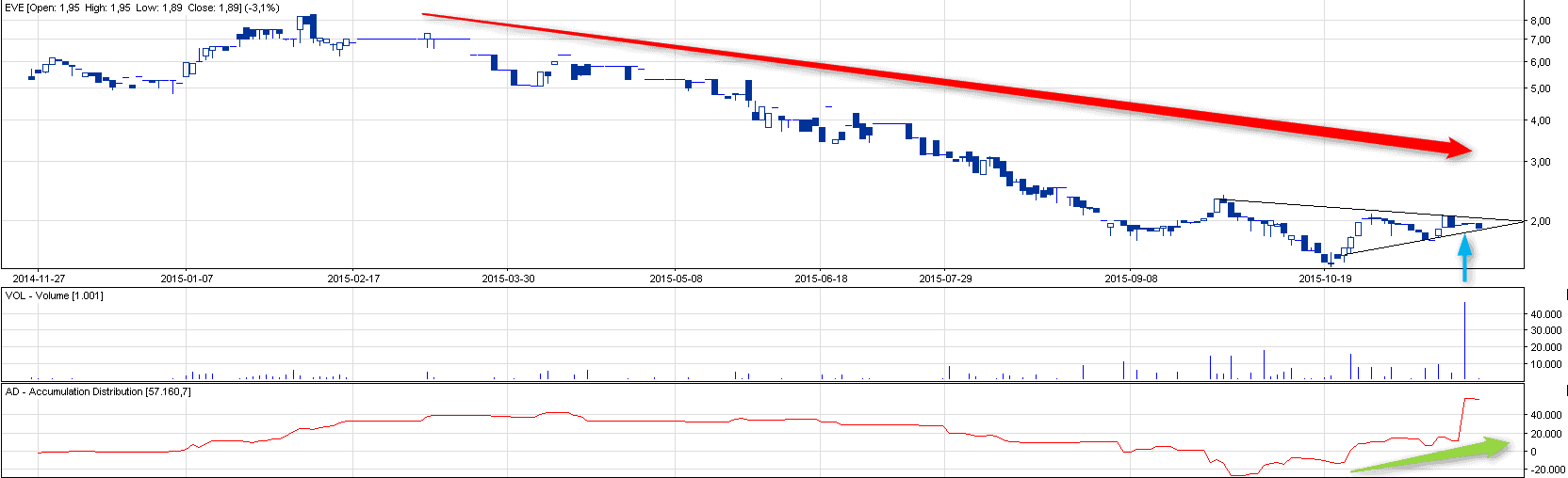 Pod względem długoterminowym można poważnie myśleć nad zakończeniem długoterminowego trendu spadkowego. Kurs osuwa się na razie po wyznaczonej linii, ale powinien niebawem odbić się i powędrować ponownie w górę. Sugerować można się ew. wzrostami głównie na podstawie utrzymującego się wskaźnika AD oraz niskimi obrotami przy spadkach.