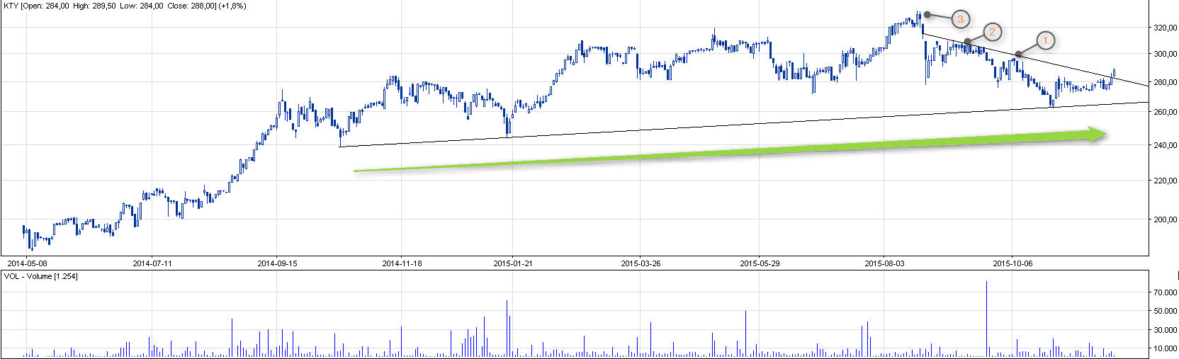 Komentarz: Spółka trwa w swoiim długoterminowym trendzie wzrostowym, aczkolwiek mieliśmy mocne przesłanki do zerwania z pozytywną tendencją. Spółka na tę chwilę wygląda kusząco, bowiem przerwała trwającą od sierpnia złą passę wybijając się z pewnej jakości trójkąta. Opory dla wykresu zostały kolejno oznaczne: 1) 296 zł; 2) 306,5 zł; 3) 330 zł. Kluczowymi punktami obronnymi sa 270 zł oraz 262 zł, natomiast najbliższe wsparcia znajdują się na 274 zł oraz 280 zł.