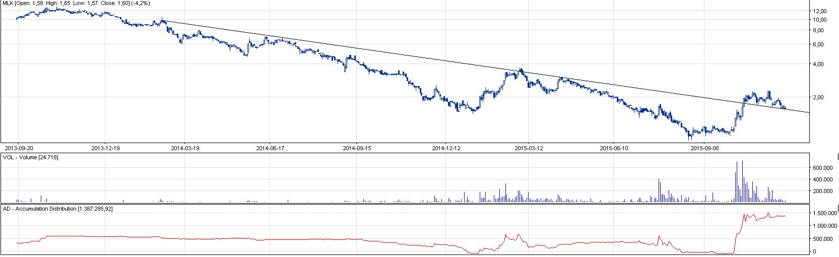 Komentarz: W zeszły poniedziałek doszło do utworzenia historycznego obrotu na walorze, który to mocno pchnął wskaźnik AD w górę. Uproszczając można domniemać, że doszło do mocniejszego zaangażowania przez akcjonariusza, co powinno dobrze rokować. Spółka utrzymuje się w spadkowym trendzie, jednakże od jakiegoś czasu porusza się w trendzie bocznym. Sytuację taką byki mogą wykorzystać do odwrócenia trendu, o ile neutralne obecnie wskaźniki dadzą wyraźny sygnał kupna. Na tę chwilę nie kupowałbym akcji poniżej przykładowego LimAkt, bowiem sytuacja nadal nie jest klarowna, a średni obrót na spółce ledwo co jest czterocyfrowy. Sugeruję dodać walor do górnej listy obserwowanych spółek i na razie obserwować.