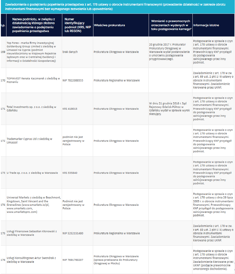 Najbardziej znane podmioty znajdujące się na liście, to m.in. Fraktal Trader (szkolenia forex), Nova Giełda Inwestycje (prezesem której jest Mariusz Patrowicz).