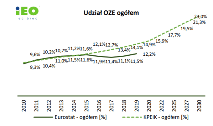 Najistotniej do osiągnięcia celu mają się przysłużyć OZE w elektroenergetyce (32 proc.). Od 2016 roku Polska zaczęła odchodzić od wymaganej trajektorii realizacji celu. Według danych Eurostatu na koniec 2019 roku udział OZE w zużyciu energii finalnej przekraczał nieznacznie 12 proc. Oznaczało to, że aby dochować deklaracji w ciągu następnych 11 lat musiałby się niemal podwoić. Regres po 2016 roku był spowodowany niekorzystnymi regulacjami prawnymi związanymi z budową farm wiatrowych – ustawa 10H.