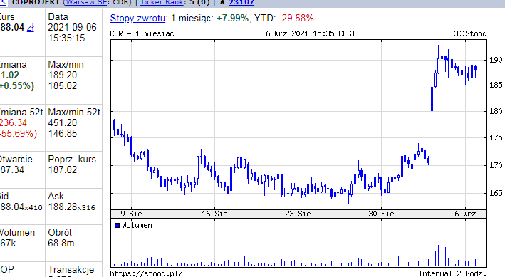 Jeszcze do czwartku wydawało się, że CD Projekt to wielki przegrany wśród spółek nie tylko gamingowych, ale w ogóle firm notowanych na polskim parkiecie. Po sukcesie w 2020 roku, nastąpiły niespodziewane duże zniżki na akcjach spółki. Spowodowane były one przede wszystkim niedogodnościami związanymi z grą „Cyberpunk 2077” i krytyką, jaka na nią spała. Jednak po ogłoszeniu przez spółkę wyników finansowych za drugi kwartał b. r. w zeszłą środę, akcje studia zanotowały wzrosty o prawie 10 procent. Od tej pory wykres spółki konsoliduje się w obszarze wyceny 186 – 187 złotych za akcję i utrzymuje na podobnym poziomie z niewielkimi wahaniami.